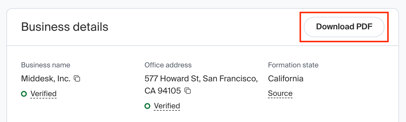 To download a PDF report of a Business, navigate to that Business's overview. Under the Business details pane, click Download PDF.
