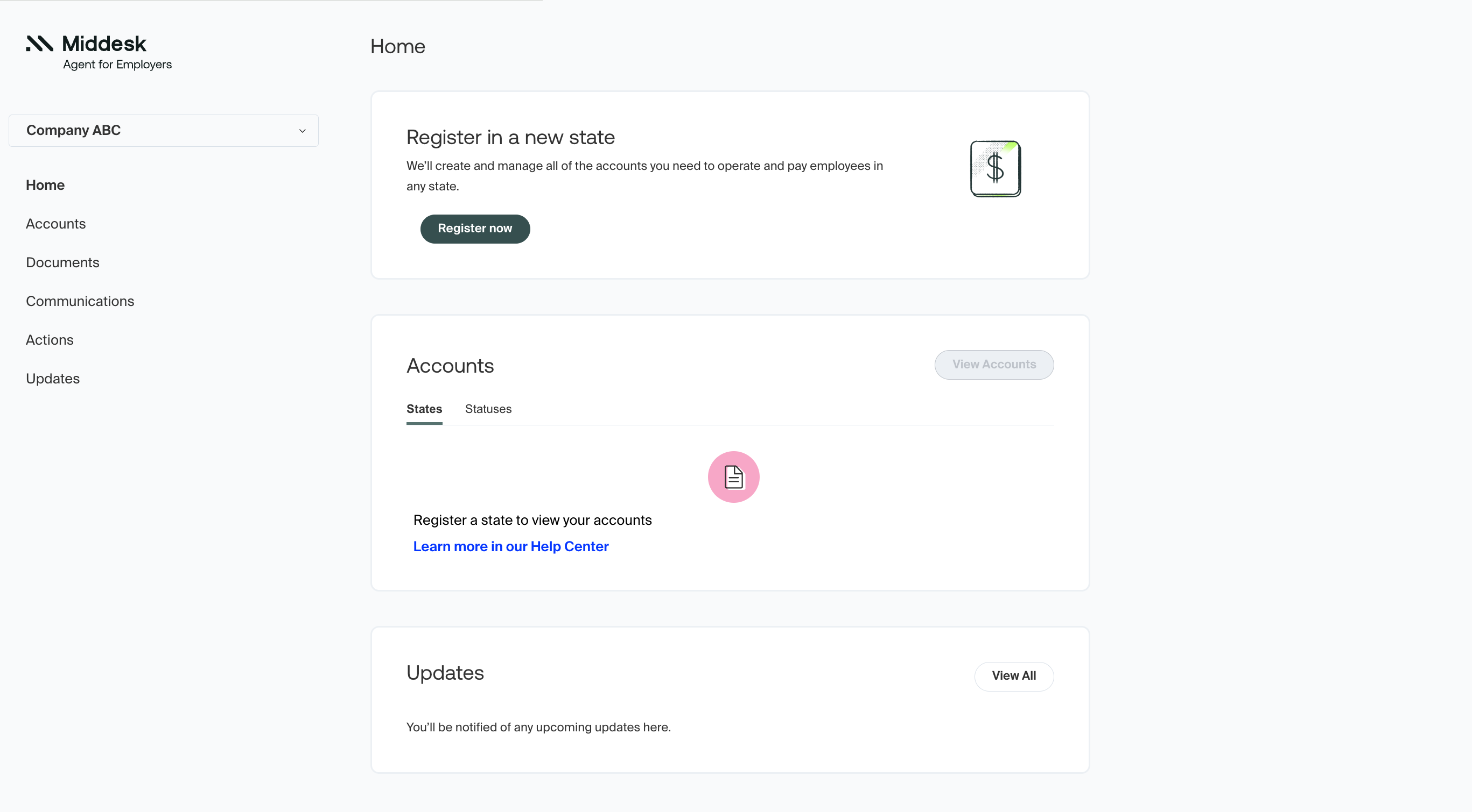 The Middesk dashboard is an all-in-one intuitive resource that allows your business to track and manage your state registrations and accounts.