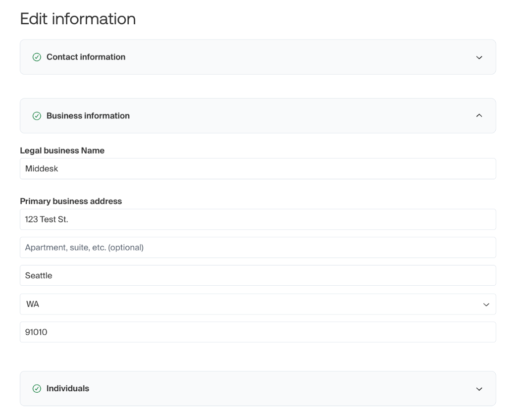 From there, you can click on the “Business information” drop-down menu which will allow you to view and edit the legal business name and primary address. Once this has been updated, you can save your changes using the button at the bottom of the page.