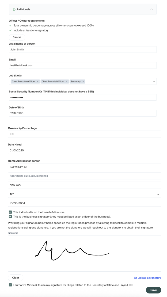 From there, you can click on the “Individuals” drop-down menu which will allow you to view and edit the officer/owner info for your business. Once this has been updated, you can save you changes using the button at the bottom of the page.