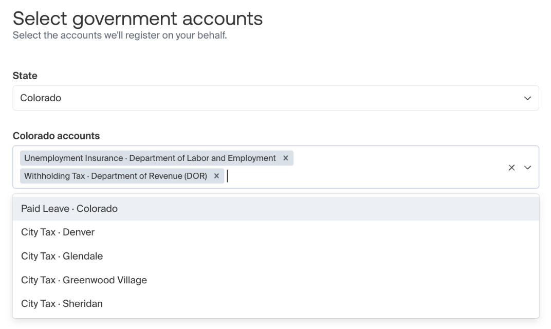 In the example below, you’d need to make sure to select “Paid Leave - Colorado” if this was a registration you required in addition to CO withholding and unemployment tax.