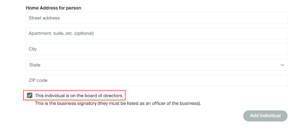 From there, you will scroll to the bottom of the page, as pictured below, to find a checkbox that, if selected, will designate the officer as a director. This will be located below the address section, and be next to where you mark a signatory.